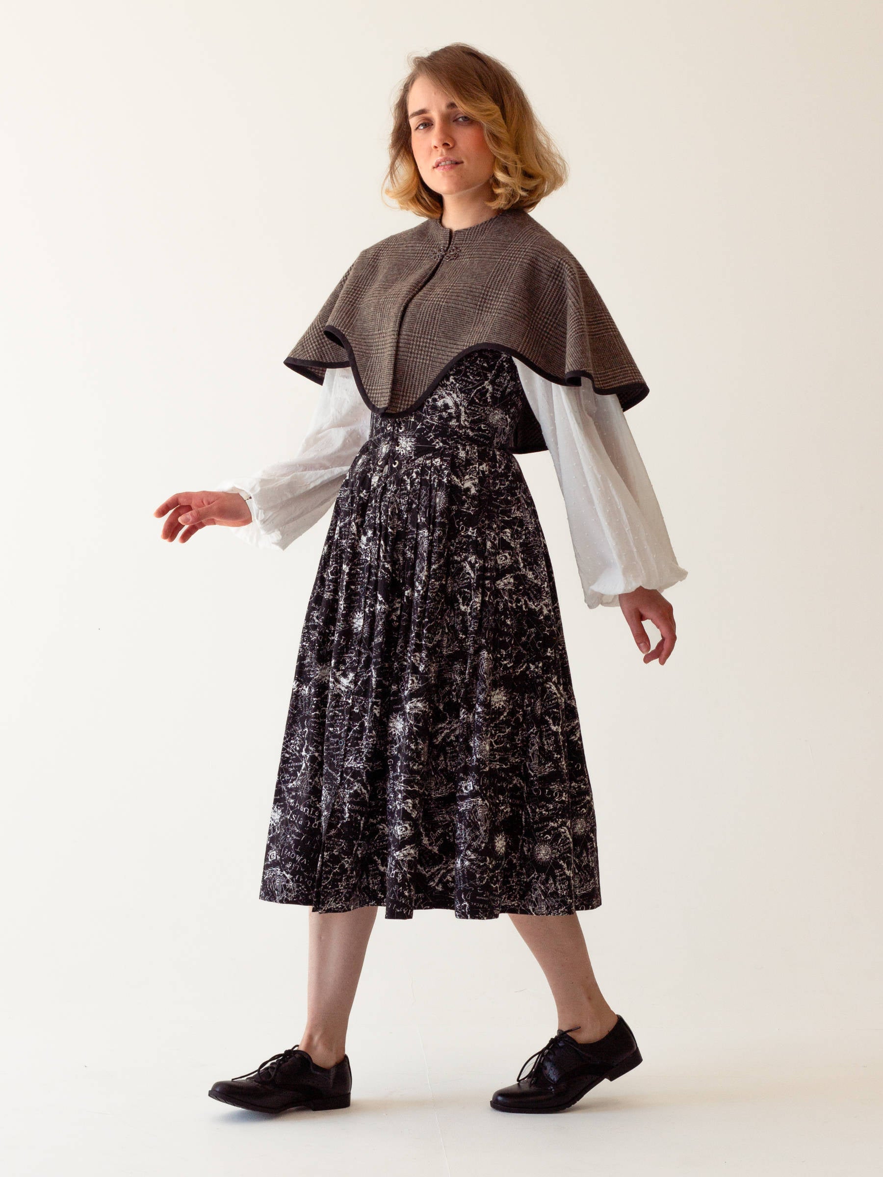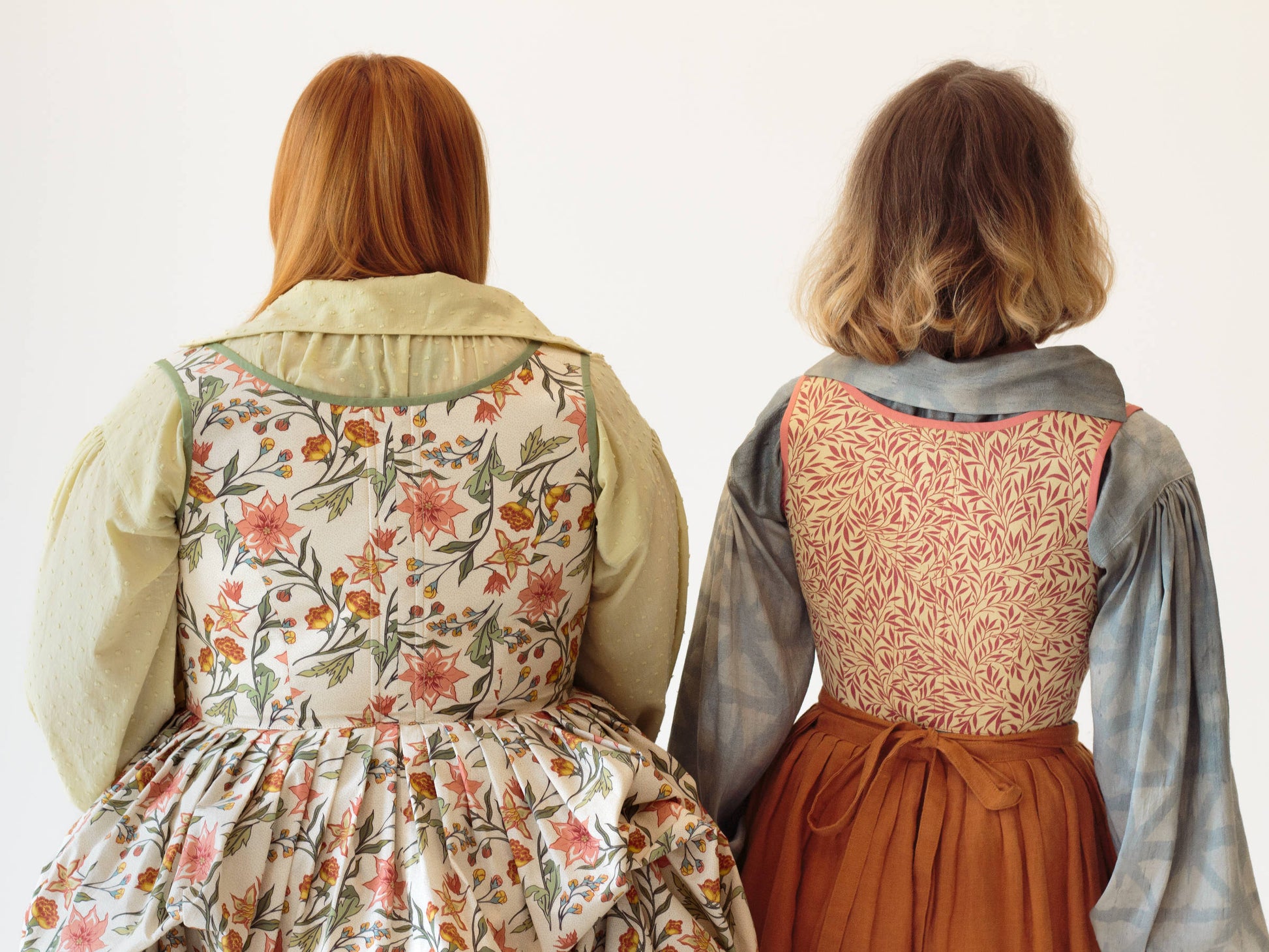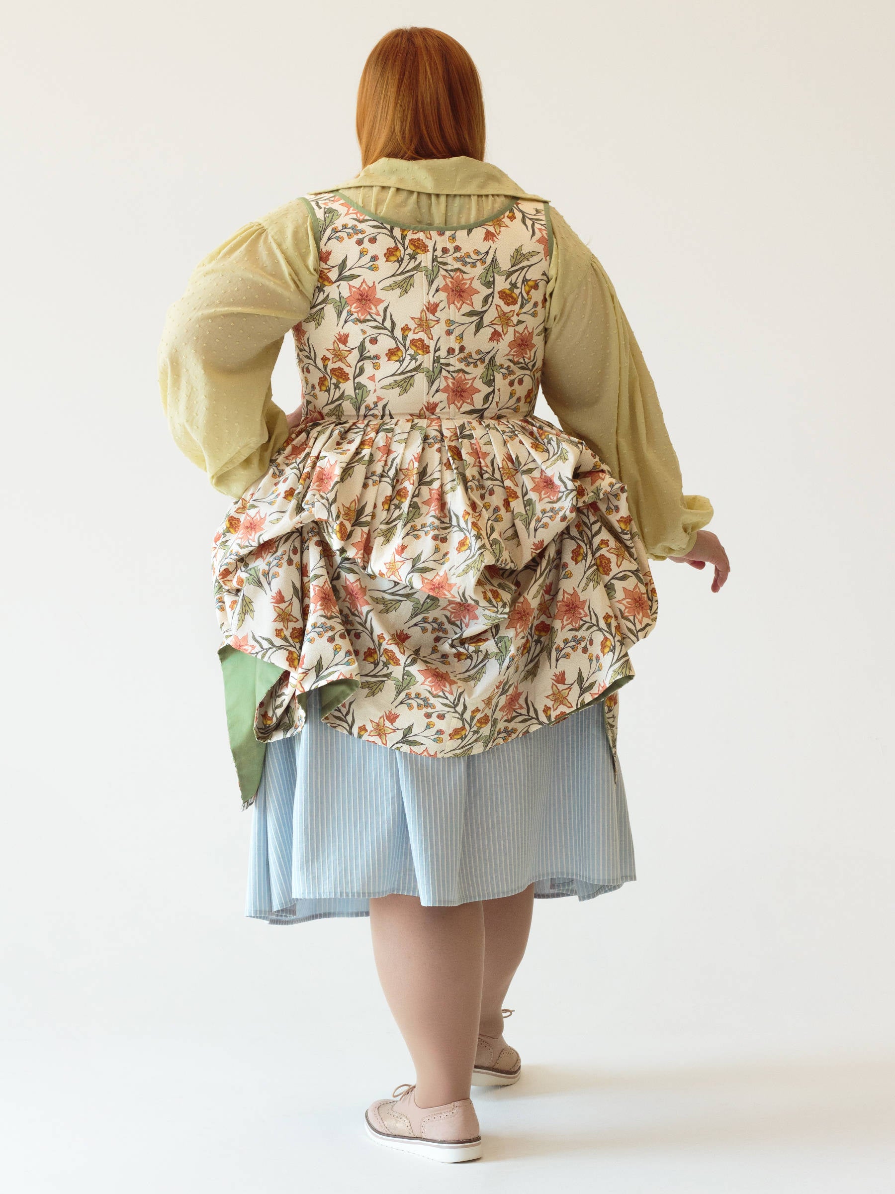 The Georgian Polonaise Dress takes inspiration from the Robe à la Polonaise style of the late 18th century and adapts it into the perfect modern layering piece. This sleeveless dress features a supportive bodice with lace-up closure, a mid-length skirt with hidden bustle ties, and a contrasting hem facing. The skirt can be worn either buttoned closed, open, or bustled up to reveal another skirt (or maybe your favourite jeans) underneath.